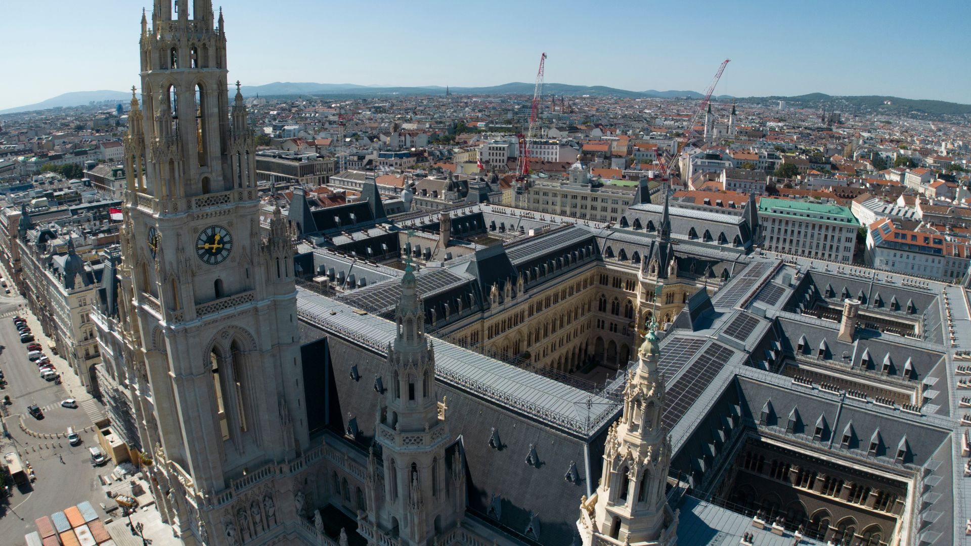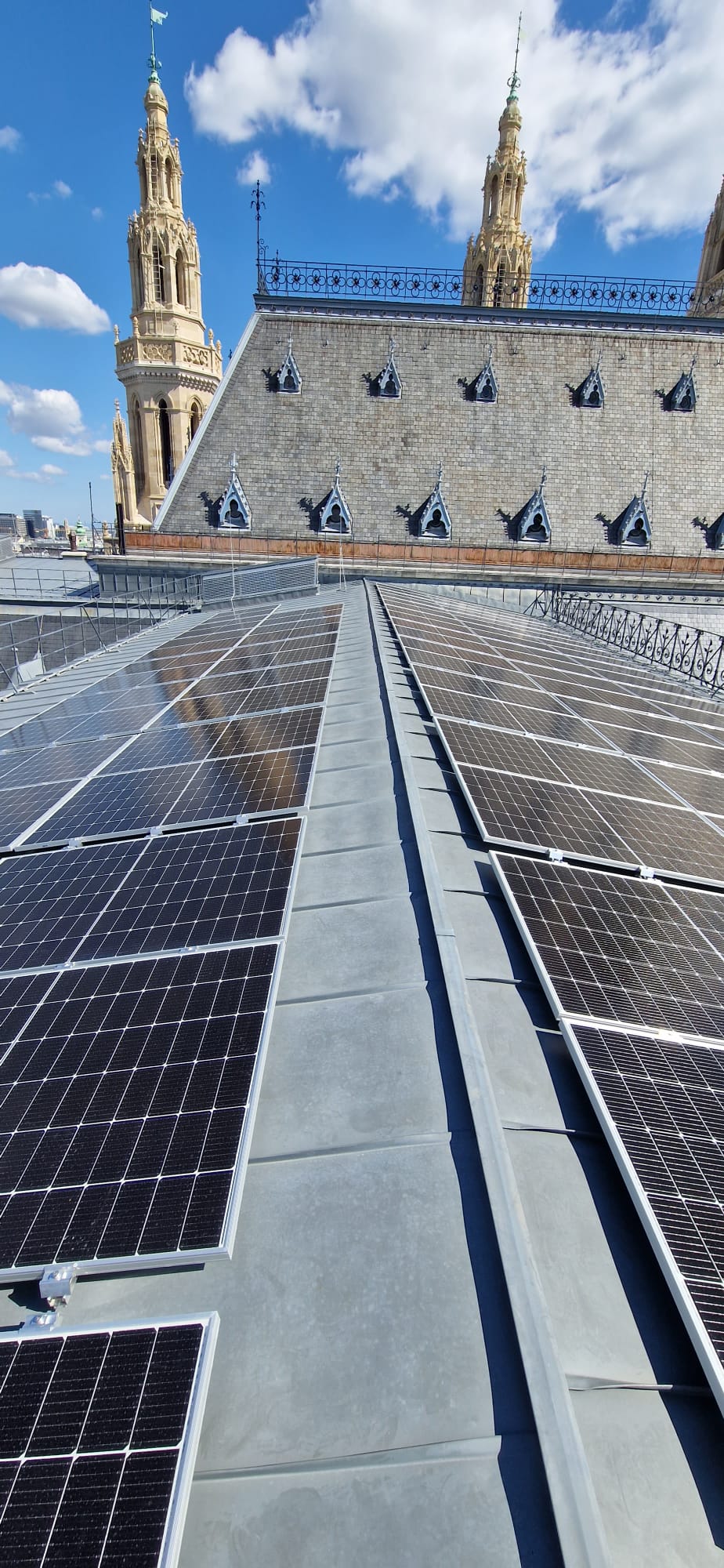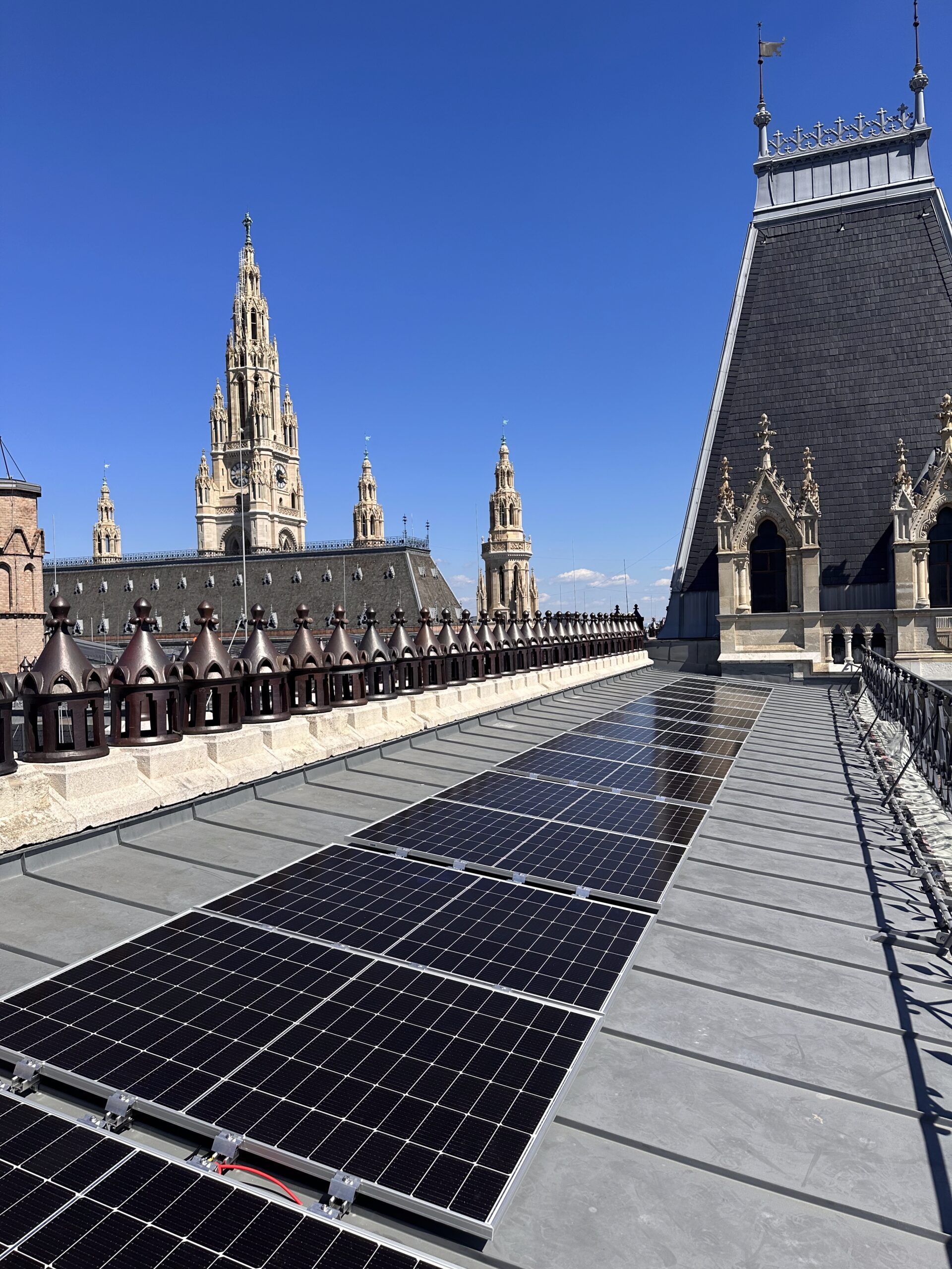 Mit der Fertigstellung der PV-Anlage (234,5 kWp) am Wiener Rathaus hat die PVI ein Vorzeigeprojekt realisiert, das Tradition und Innovation miteinander verbindet. Auf dem denkmalgeschützten Gebäude in 65 Metern Höhe wurden moderne Risen RSM40 410Wp Module auf einer K2-Systems-Unterkonstruktion installiert. Die besondere Herausforderung: Der gesamte Bauprozess musste während des laufenden Betriebs im Wiener Rathaus stattfinden. Anlieferung und Montage erfolgten daher über einen Gerüstturm und Leiterlift – eine logistische Meisterleistung. Das Ergebnis: Eine PV-Anlage, die jährlich rund 200.000 kWh sauberen Strom produziert und damit einen wesentlichen Beitrag zur Nachhaltigkeit der Stadt Wien leistet.